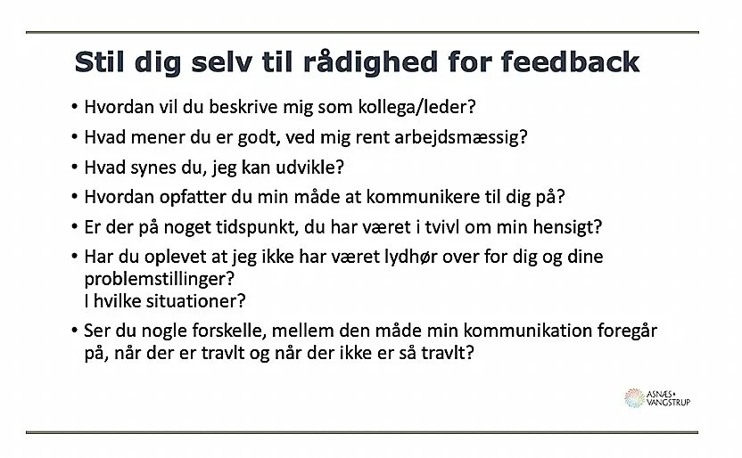At kunne give og modtage feedback er et vigtigt værktøj i kommunikationen med andre. Det handler grundlæggende om tilgangen til andre mennesker. Hvis man udelukkende fokuserer på fejl, skaber det en tilgang, som dræner arbejdsmiljøet og svækker kommunikationen. Det påvirker også kollegialt samarbejde, da det gør det sværere at “spille hinanden gode”.