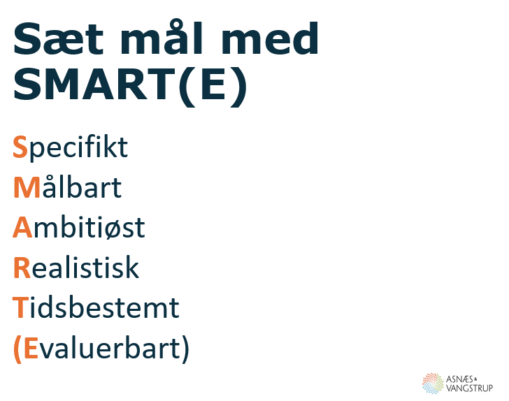 En metode til at sætte mål er at bruge SMART(E) modellen. Se nedenfor.