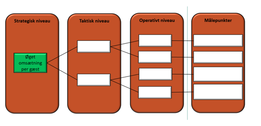 Tænk over hvilke mål der er i din organisation på taktisk plan (mellemledere ) og operationelt plan (medarbejdere. Målepunkter er det konkrete der kan måles og som understøtter det store mål
