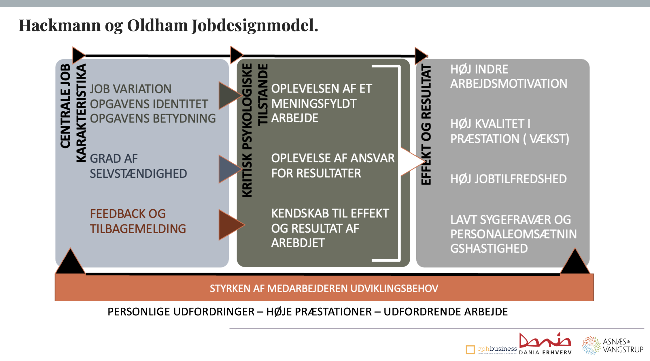 Jo stærkere medarbejderens behov for udvikling er, desto mere udtalt bliver effekten af jobegenskaberne på de arbejdsmæssige konsekvenser. Med andre ord: Medarbejdere med høj udviklingsmotivation oplever højere motivation, større arbejdsglæde og bedre resultater, når deres jobdesign understøtter de fem centrale jobegenskaber.