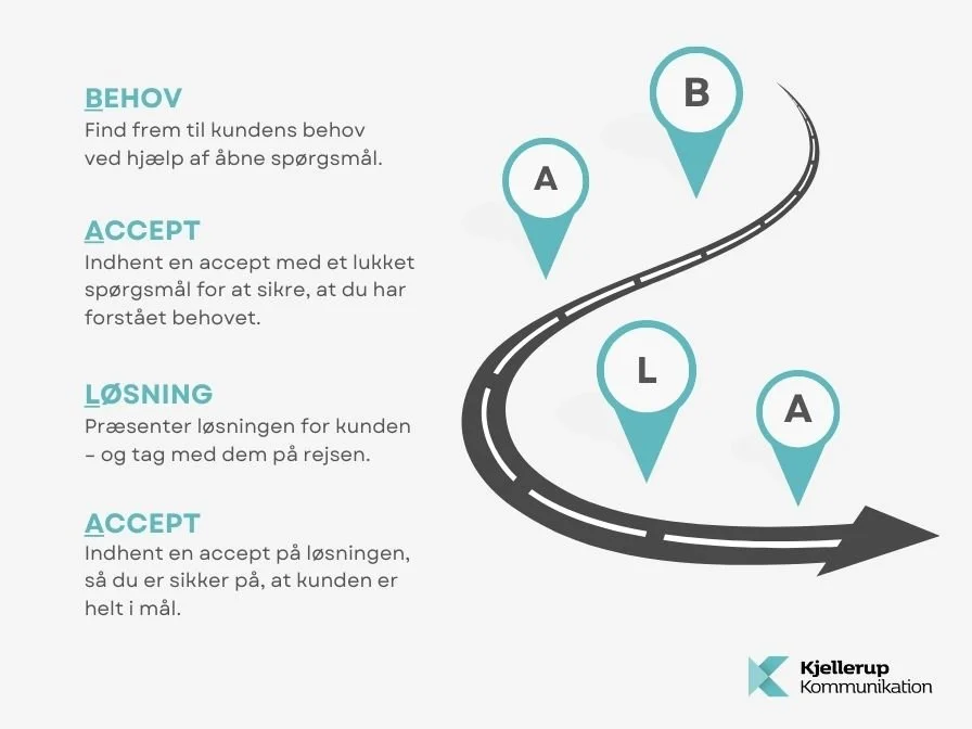 Accept: få gæsten til at forstå at deres behov bliver opfyldt ved at tage denne “løsning”. De accepterer når det bliver tydeligt at deres behov bliver opfyldt.