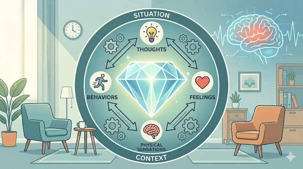 The Cognitive Triangle (also known as the Cognitive-Behavioral Triangle) is a foundational concept in Cognitive Behavioral Therapy (CBT). It illustrates the interconnected relationship between our thoughts, feelings, and behaviors.